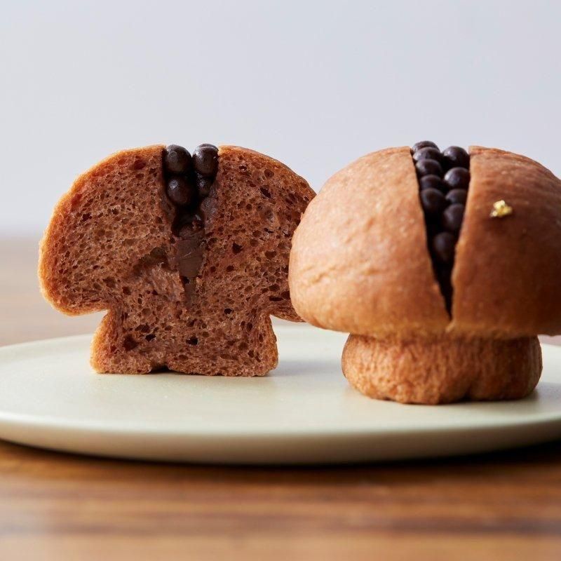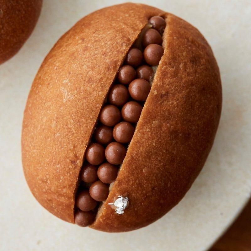 しっとりとしたココアブリオッシュに、口どけなめらかな自家製ガナッシュを絞り込み、カリカリのパールクラッカンをオン。チョコレートを異なる三つの食感で楽しむ大人の菓子パンです。濃厚な自家製ガナッシュにはカオカ社のオーガニックショコラを使用しています。